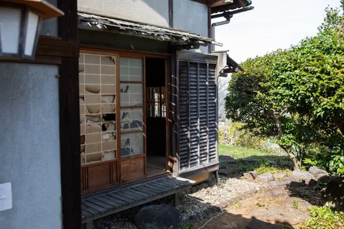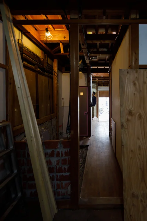 この長屋は元々別の住居で、それらの間には裏側へつづく道が通っていたようです。いつしか道も含めて1つの家として住まわれていました。家具が散乱し、床や土壁ははがれ、柱は一部朽ちているような状態でした。