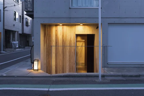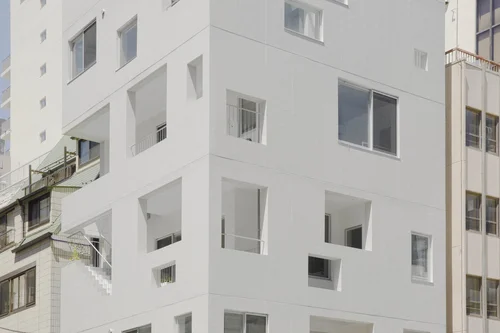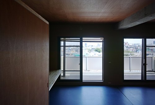 雑居ビル、マンション、ホテルが建ち並ぶ都心の大通り沿いに計画した2世帯住宅である。外周にテラスや縦動線などを配置した、入れ子のような平面構成になっている。バッファーとしてのテラス、それと連続する屋外階段、大きくゆとりのある内部階段と踊り場をもち、その隙間に各世帯の占有空間、2世帯の共有空間を挿入した。各階のテラスを介して、世帯同士のゆるいつながりを生み出している。