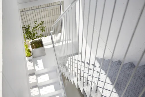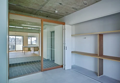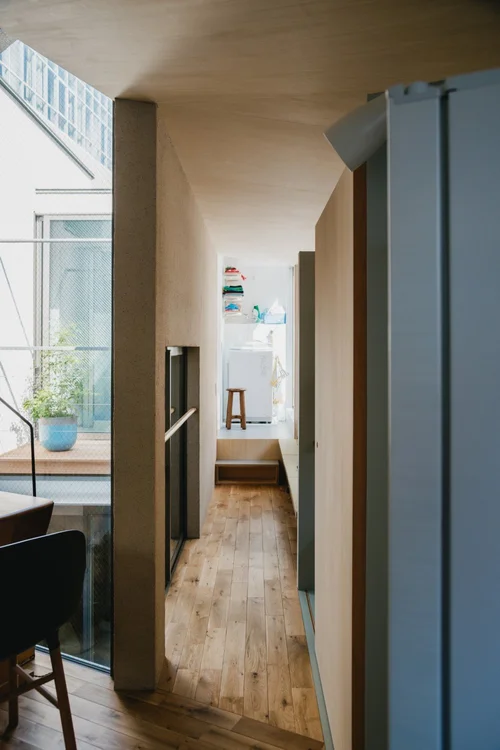 テラスは半外部でありながら、内部的な仕上げで統一し、内部階段と踊り場は、隣地の建物に囲まれた裏手にはあるものの、開口を多数設けることで、外部的な明るい空間とした。また、親世帯の住居である2階と、子世帯の住居である4・5階の間には、あえて用途を規定しない余白の階層を挿入している。
