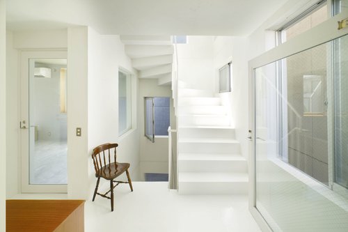 用途のない場所は、この住宅の床面積の半分近くを占め、そこを「小さな敷地」と呼ぶことにした。家の中に小さな敷地をいくつも設けることで、我々が建築を考えるのと同じように、使い手はその場所を自ら設計して生活をしていく。幅広でゆとりのある階段でお茶を飲みながら本を読んだり、部屋の様な大きな踊り場で仕事をしたり、内部の様なテラスでランチをしたり、余白の3階を写真スタジオとして利用したり。