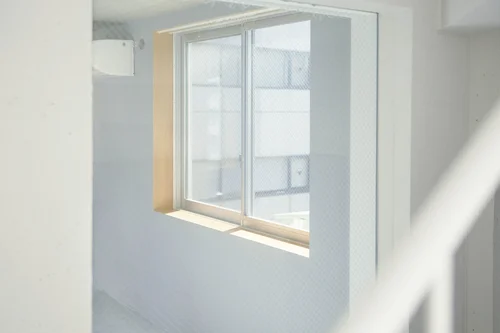 壁に開口を開けることは、生きるための環境をつくる行為だと思う。内部に風や光、風景が入り込み、暮らしていて気持ちが良いという根源的な住宅。この住宅では、隣地の建物と視線が交差しないように調整した開口と、周辺も関係なしに、この位置にあると光や風が気持ちが良いだろうと感覚的設けた開口もある。その矛盾した両者を同居させることで隣家との間合い、都市との距離感、親と子の距離を離しつつ繋ぐ関係を目指した。