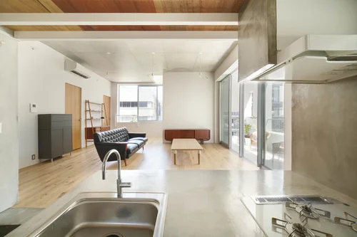 できるだけ単純な方法で、この既存の“ピカピカ”とこれから生まれる“新しい環境”とを重ね合わせられないかと考えた。そこで部屋の中央に大きな中庭を設けることにした。中庭といっても、既存玄関のスケールを約6倍に拡張し、土間とも玄関とも中庭ともいえる曖昧な場とした。この中庭はLDK・個室・水回りのほぼすべてに隣接し、施主は常に住まいの中心である中庭と関わりながら生活する。建具を開け放つと南北のバルコニーが連続して一体となり、空間全体がひとつの大きなバルコニーのようにも感じられる。個室は中庭と既存バルコニーの両側に囲まれ、明るい光の中で目覚め、風呂上がりには風が通り抜ける心地よい休憩の場にもなる。