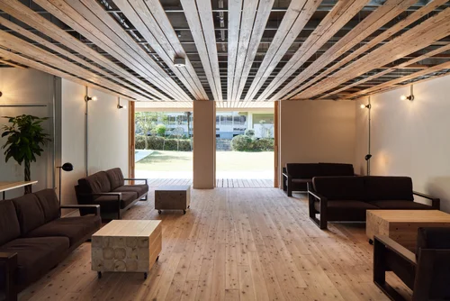 既存の建築を継承するため、構成だけではなく放置されていた家具や照明、建具を再利用し、柱や梁、屋根の裏、土壁も元の表情のまま残しています。古いものを残しつつも新しさも感じられるよう、あえて未完成のような状態で止めています。