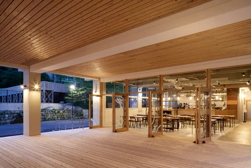 山と川に囲まれた敷地には、大きな樹木や岩が点在しており、それもひとつの原風景になっている。家具やサインは、量感のあるデザインとし、建築内部だけでなく敷地内にも散りばめることで、人工と自然、古いものと新しいものをつなげる要素として機能させている。