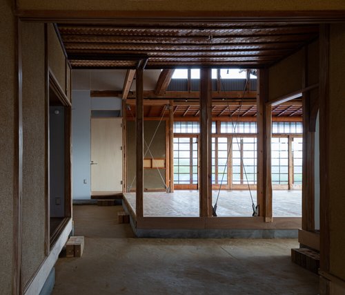 壁や天井や床が取り除かれ、かつてそこにあった材料による新たな仕上げで包まれた大きな展示室が生まれた。今後は余った古建具で展示什器がつくられ、木材が庭の小屋となる予定である。