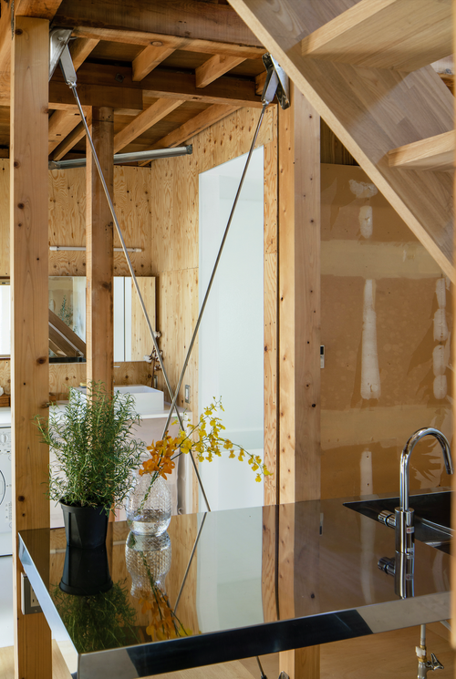 機能を重ねつつ、床に孔をあけ、お風呂や洗面台はオープンな空間、廊下は収納となり、いくつかの吹き抜けと一部にはルーバーをかけて居場所をつくっていきました。
