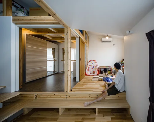 プランはそのままに、スキップフロアとすることで無駄な廊下をなくし、新たな居場所をつくった。少しずつ床があがることで1階のリビングに変化が生まれる。求められた3つの寝室のうち1つはオープンに、もう1つは建具によってライフスタイルに応じて開いたり閉じたりできるようにした。