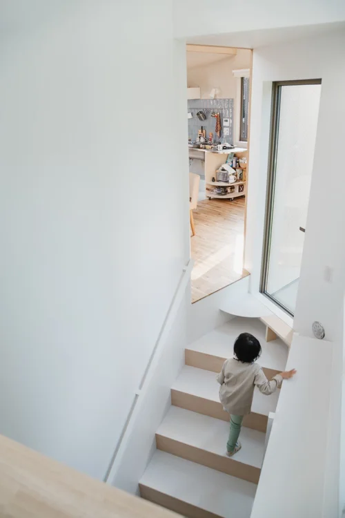 そしてプライバシーに配慮しつつ、内外いたるところに開口を設けた。一日中いろいろなところから光が入り、どこにいても家族の気配が感じられる空間となる。リビング上の光を取り入れるための塔と室内窓、スキップフロアや蹴上の無い階段により多方向に視線が抜けていくことで、面積を抑えつつも広がりのある空間とした。