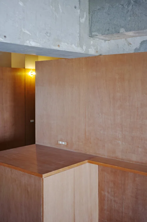 自ずと玄関、水回り、収納が部屋の中心へと集まってきた。それら機能は木のハコとして抽象化され、天井のコンクリート梁(構造機能が抽象化された存在)の凹凸と寄り添い、離れ、呼応しながら、マンションの一室の中にランドスケープを形成していく。その二つのランドスケープの余剰は機能からはみ出た窓辺やスキマ空間などの純粋な居場所として現れた。