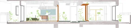 孔をあけて人の動線を変えてあげることで、広い敷地にアクティビティが生まれています。工事後半年で、畑、倉庫、ピザ窯、ブランコ、駐輪場が施主の手でつくられました。施主が自分たちで住まいを育てていくためのきっかけをつくった計画です。